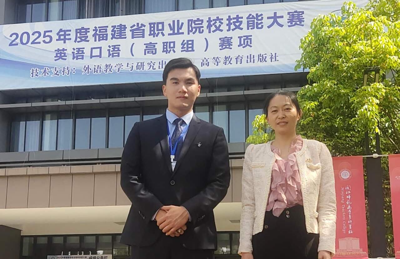 参赛选手翁子昂在叶雅观老师的指导下,经历“即兴演讲”“情景交流”“职场描述”和“职场辩论”四个环节的激烈角逐,继2024年后再次斩获该赛项一等奖。