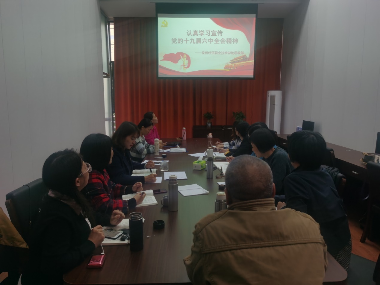 11月23日下午,思政部组织全体思政教师在新教二楼会议室开展推进党的十九届六中全会精神融入思想政治理论课教学专题备课会。会议由思政部负责人文粉娟主持,形势与政策教研室主任许婵娟主讲。许婵娟作为主备课教师,从党的十九届六中全会基本情况、具有决...