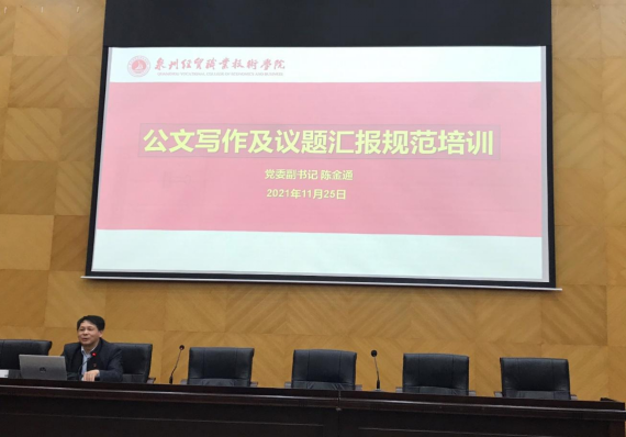 为提升学院教职员工公文写作质量,规范议题汇报格式、内容,11月25日下午,党委副书记陈金通为各处室、系部、慈山分院相关工作人员进行业务培训。 培训会上,陈金通副书记结合多年的工作实践和经验,从“公文易错案例分析”“办公会议题规范要求”“会务接...