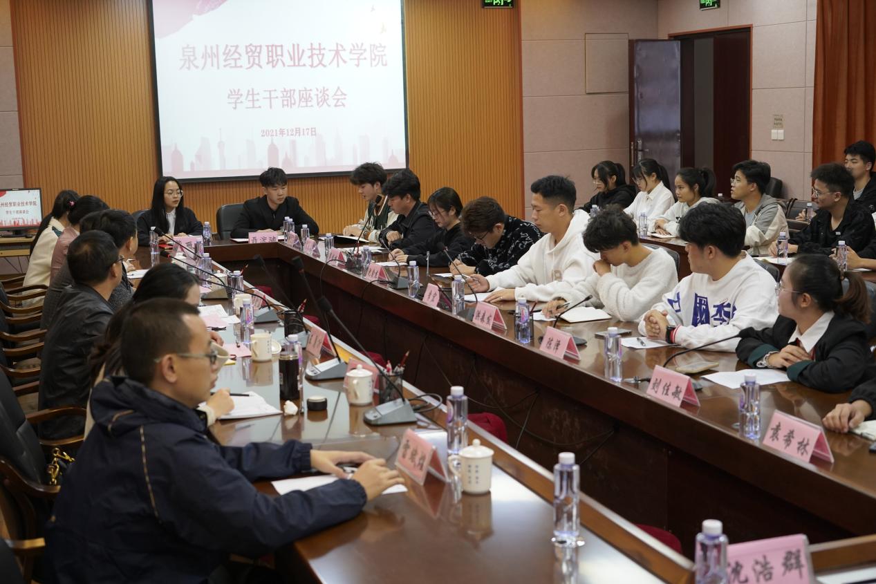 12月17日下午,学院在行政楼206会议室召开学生干部座谈会。学院党委副书记陈金通,学生处、团委,学生会、青年志愿者协会及各系学生干部代表参加座谈会。学生会、团委会、青协及各系学生干部代表分别就今年开展工作的情况、现阶段工作的不足之处和今后的工...