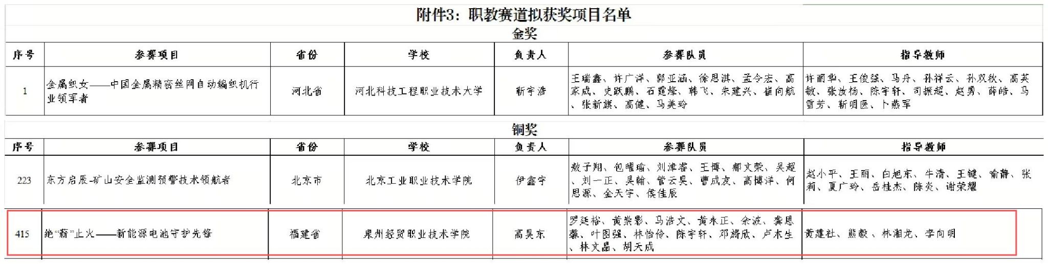 2024年10月15日,中国国际大学生创新大赛(2024)总决赛在上海交通大学圆满落下帷幕,本次大赛吸引了全球153个国家和地区的5406所学校参与,总计提交项目514万个,报名人数达到2083.6万人次。经过激烈角逐,我院《绝“薪”止火——新能源电池守护先锋》项目(团队负责人:高昊东,团队成员:罗廷裕、黄崇影、马浩文、黄永正、余波、龚恩馨、叶图强、林怡伶、陈宇轩、邓旖欣、卢木生、林文晶、胡天成,指导老师:黄建社、熊毅 、林湘龙、李向明)荣获大赛职教赛道铜奖,这是我院首次在该赛事国赛中获奖,也是学院继世界职业院校技能大赛、全国职业院校技能大赛教学能力比赛后实现新突破的第三个国家一级赛事,至此我院实现了在三个国家一级赛事均有所斩获。