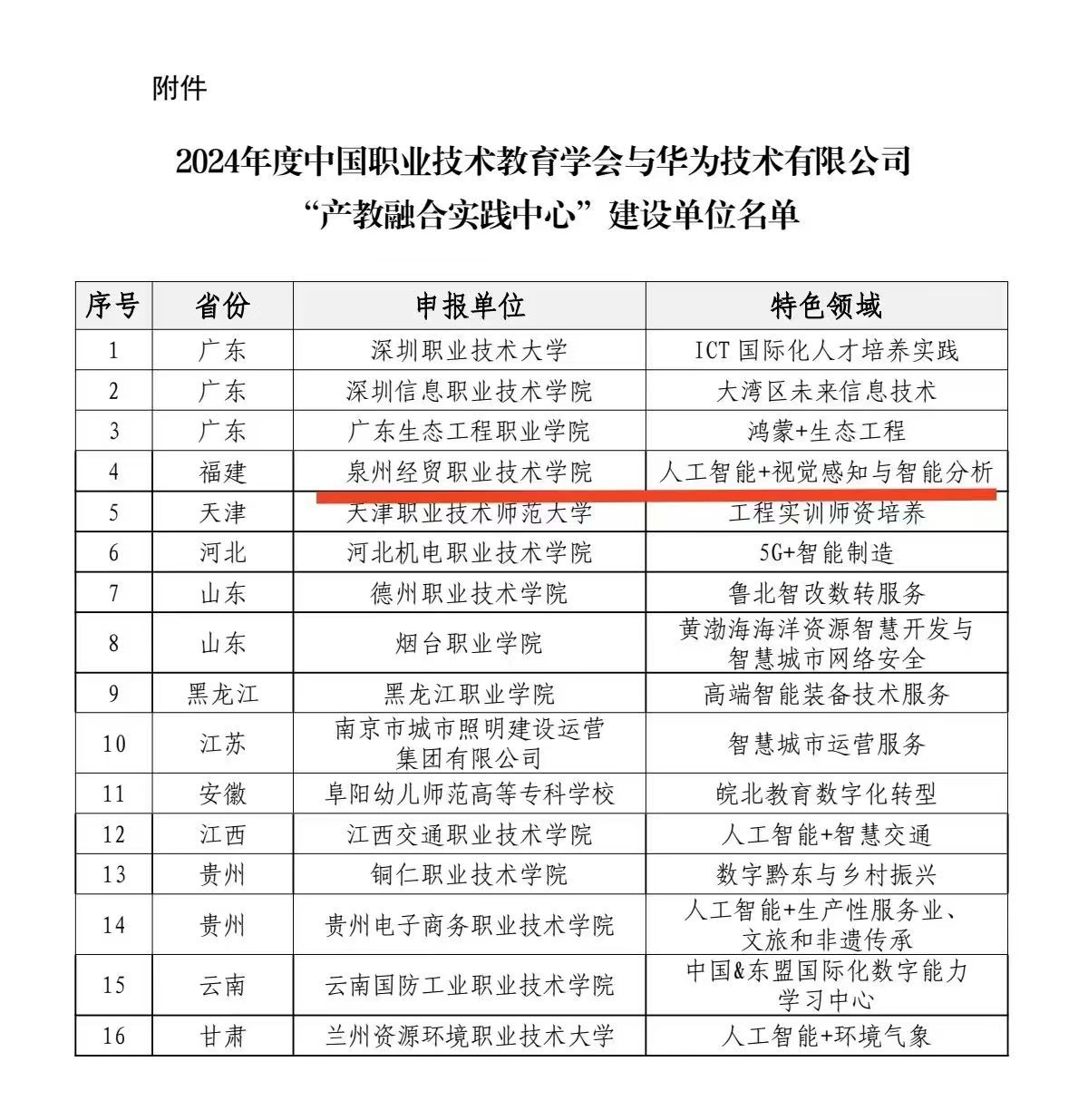 8月20日,中国职业技术教育学会与华为技术有限公司联合发布2024年产教融合实践中心建设单位名单,我院名列其中。产教融合实践中心由中国职业技术教育学会指导,依托华为技术有限公司在自主创新技术领域的领先优势,旨在全面贯彻落实党的二十大精神,着眼于科技创新和产业创新深度融合,构建“理论教学-实训实践-实习实战”三位一体模式,赋能高素质技术技能人才培养。自项目发布后,得到职教领域的高度关注和职业院校的积极参与。