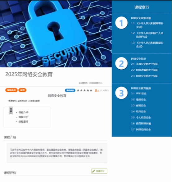 活动二:在网络学习平台开设《2025年网络安全教育》校本网络课程,组织全校学生参加在线课程学习,提升学生的网络安全法治意识,增强网络文明素养。