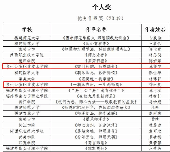 活动启动以来,慈山分院学子积极响应,充分发挥数字媒体艺术设计专业特长,将感恩教师之情融入创作,以独特视角与创意表达诠释师恩。经校级遴选与省级评审,数媒251班林锌宇、数媒253班钟雨晨两位同学的作品脱颖而出,荣获全省优秀奖。据悉,本次评选共产生优秀作品20件(涵盖本科与高职院校,不分等次,按省赛二等奖计),充分展现了我院学子扎实的专业能力与尊师重教的精神风貌。