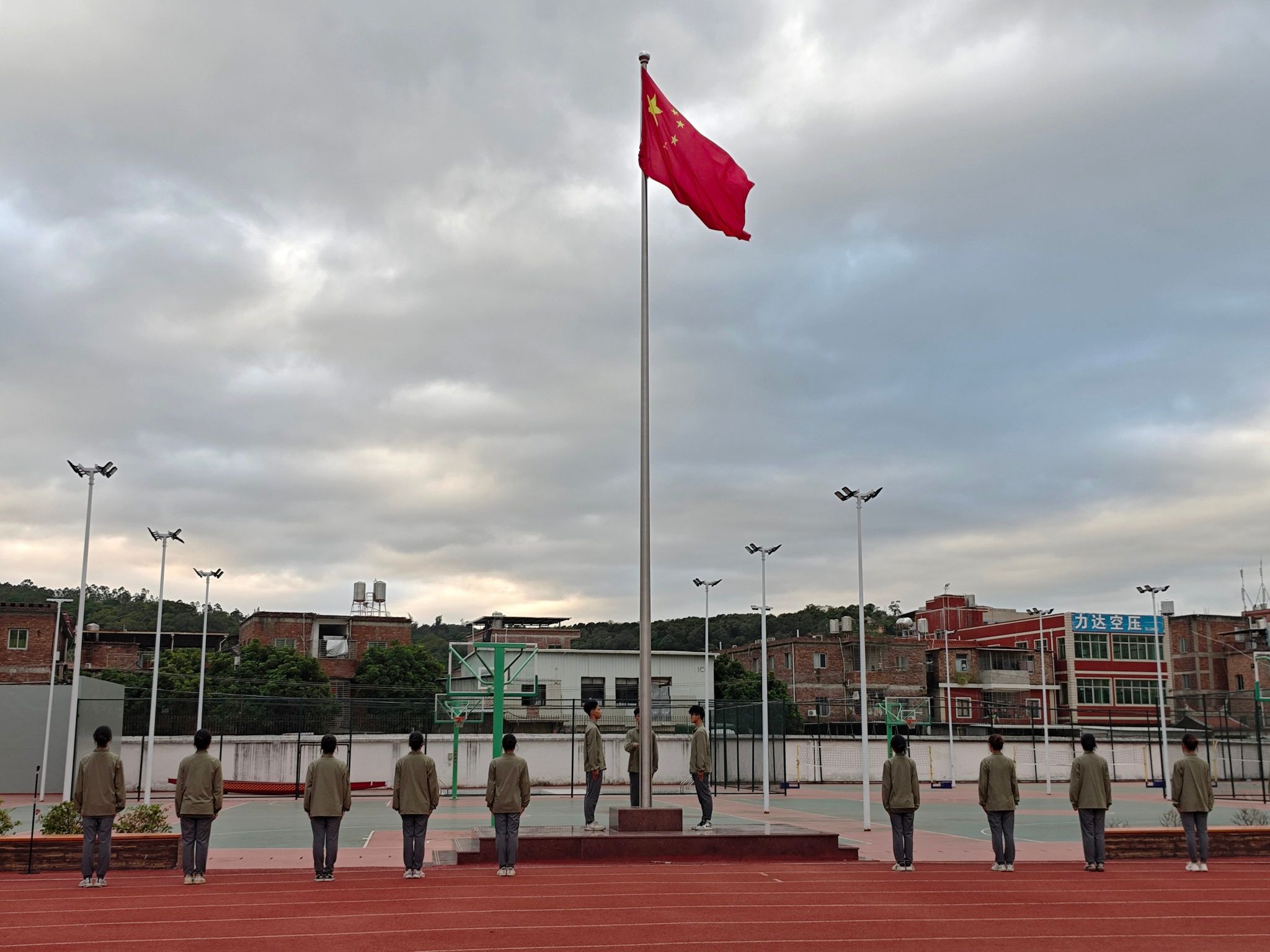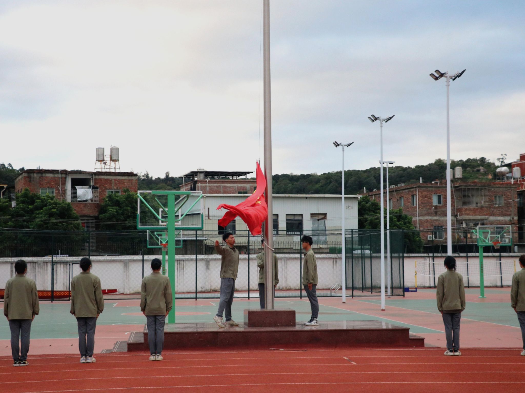 国旗护卫队迈着整齐的步伐,护送鲜艳的五星红旗至升旗台。在庄严嘹亮的《义勇军进行曲》中,国旗冉冉升起,全体师生面向红旗行注目礼,共唱国歌。